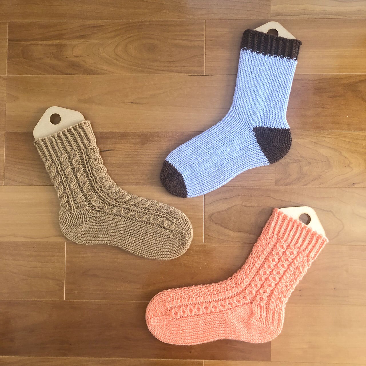 模様も、プレーンから、アラン模様、ラウンドヒールの細かな模様と、難易度が上がりますので、初心者さんは是非プレーンから編み始めてみてください。