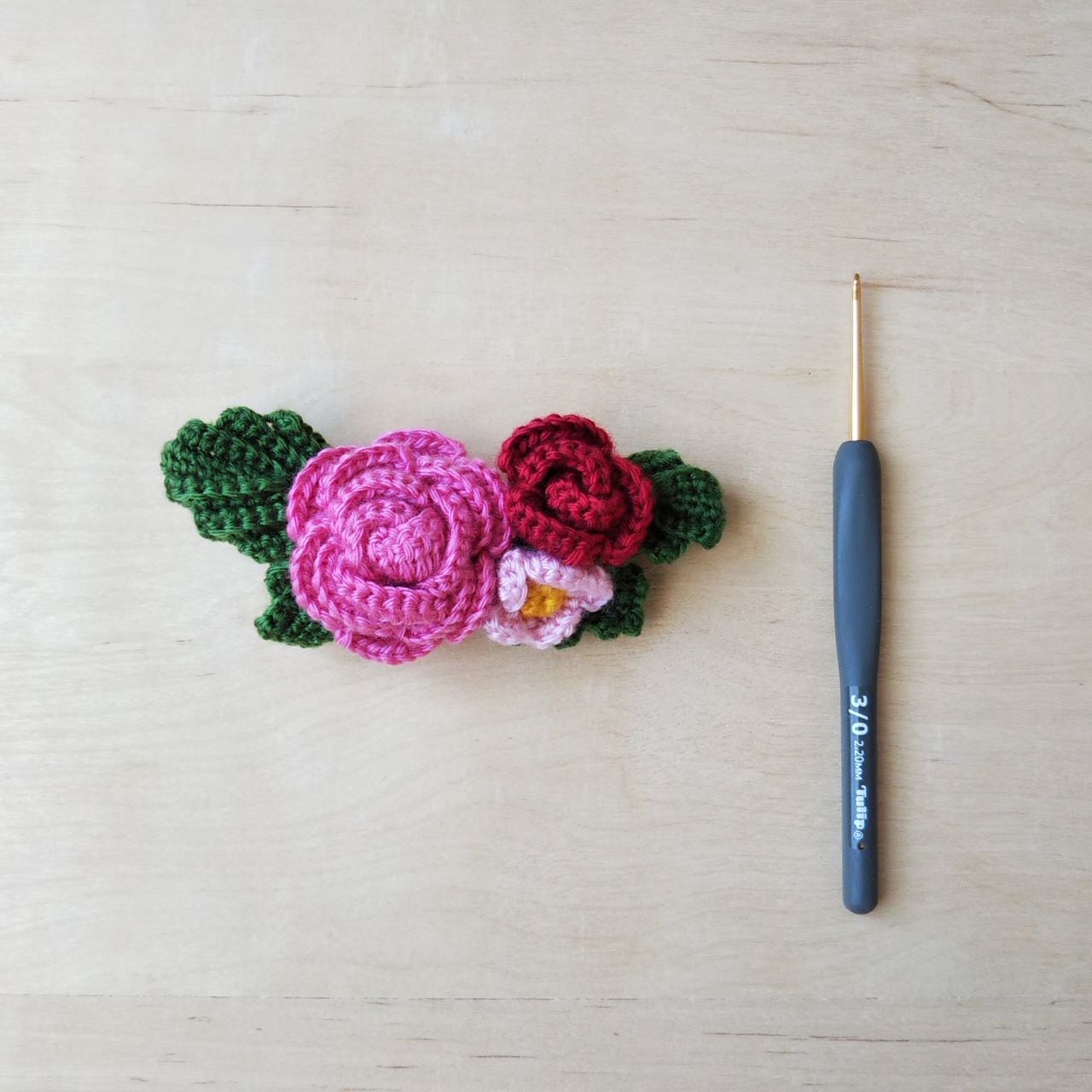 可愛いお花のモチーフやパーツを編みくるんで、可愛いヘアアクセサリーに仕上げます☆